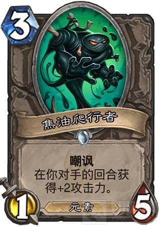 焦油爬行者—3费中身材不错的随从。焦油爬行者具有的嘲讽,在比赛前期作用非常明显,当它在比赛前期上场时,对手可能会用沉默或者是想办法消灭它,这样也可以加速通道爬行者的上场。
