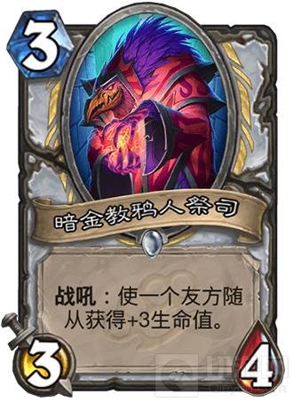 暗金教鸦人祭司—对抗任何卡组时,留暗金教鸦人祭司都没问题,特别是手里有硬币的时候。我更喜欢起手留北郡牧师,如果你起手没有北郡牧师,那就没必要留暗金教鸦人祭司了。但是如果你已经拿到了北郡牧师或者暗影升腾者,那么,用暗金教鸦人祭司给它们增加生命值,能让你在前期获得不小的优势。是否留下暗金教鸦人祭司要取决于你的手牌。
