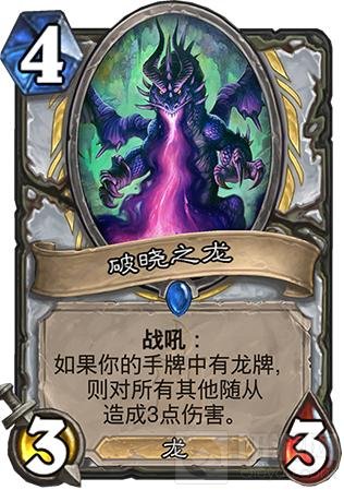 破晓之龙—它是这套卡组抵挡快攻卡组的核心。破晓之龙可以在前期清除场面,只留下3/3的自己。有时,破晓之龙的作用不仅仅是清除场面,如果你的手牌中还有通道爬行者,你甚至可以0费打出通道爬行者。使用破晓之龙的时候,要注意手牌中是否还有其他龙牌,确保让它上场可以发挥作用。