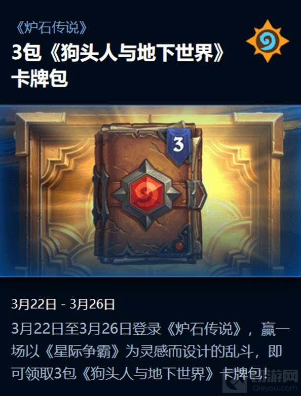 3月22日的乱斗,现在已经可以确定是是和星际有关的,说不定是合作任务或者多线操作很多卡组之类的。但是最吸引人的就是赢一场乱斗就会获得3卡包,前所未有,加上这次的补偿,白赚了6个卡包,岂不是美滋滋?