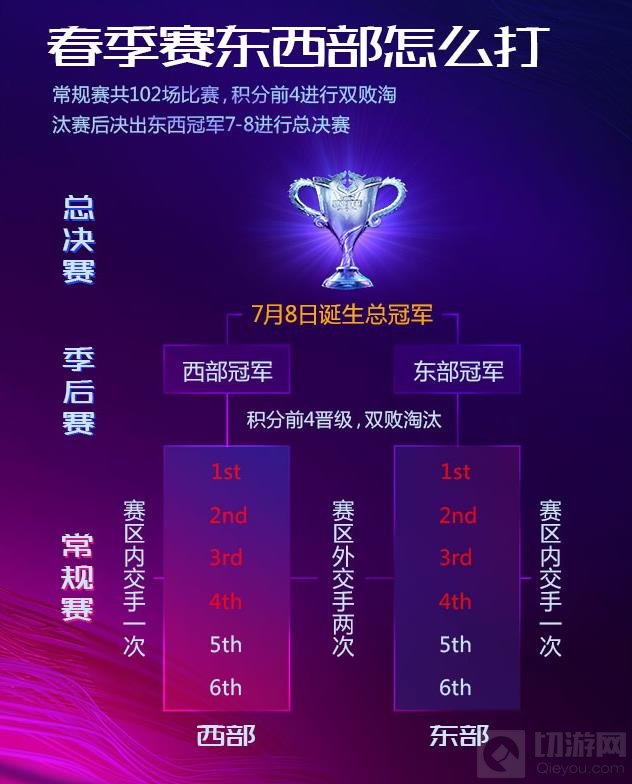 各赛区第一、二名晋级胜者组, 第三、四名进入败者组,最终东西部将各自角逐出东/西部冠军,代表各自赛区晋级总决赛,角逐KPL总冠军。
