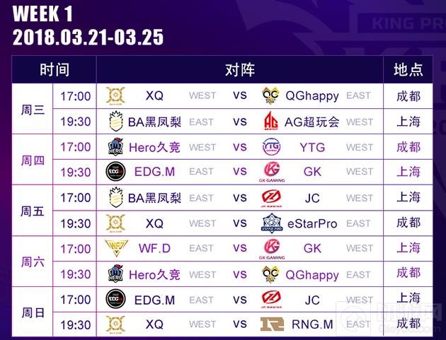 由麦当劳、vivo、浦发银行信用卡赞助的2018年KPL王者荣耀职业联赛(以下简称KPL)春季赛,将于3月21日17:00正式开赛。本次春季赛正式开启东西赛区主客场制度,东部赛区由BA黑凤梨、EDG.M、eStarPro、QGhappy、RNG.M、WF.D这6支俱乐部组成,比赛主场落户上海;西部赛区则由AG超玩会、GK、Hero久竞、JC、XQ、YTG组成,比赛主场落户成都。