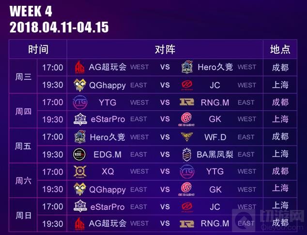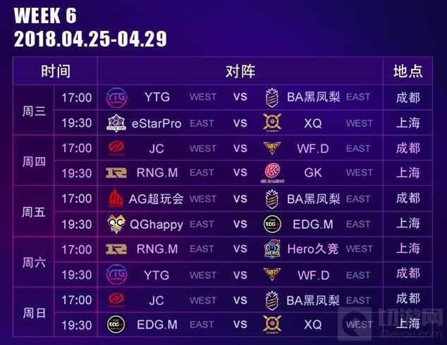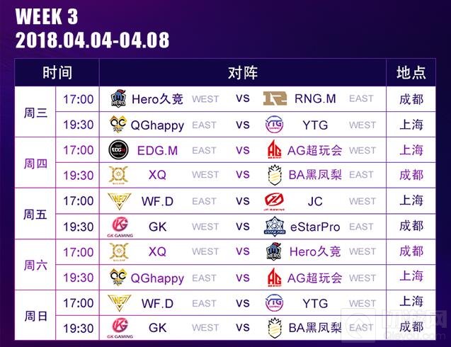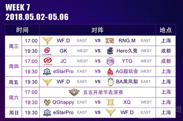 常规赛每周五个比赛日(星期三至星期日),每天17:00开赛;