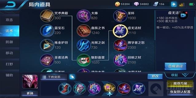 虚无法杖:在后期敌方前排英雄购买了魔女斗篷、不死鸟之眼、抵抗之靴的情况下,其法术防御已经非常高了,这时候我们需要补充一件虚无法杖,提高自己的法术穿透能力,能够有效的增加干将对敌方前排的威胁力,避免出现一套技能打到前排身上不掉血的尴尬情况。