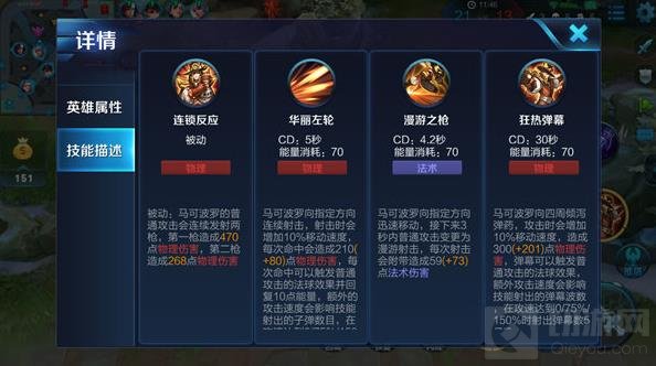 解析:马可波罗向指定方向连续射击并加速,每一枪都能对敌方英雄造成一定的物理伤害,并触发普通攻击的法球效果,即装备的特殊效果以及其二技能的伤害加成,对敌方英雄造成额外的伤害。该技能是马可波罗的核心输出技能,不论是在对线期间亦或是团战中,马可波罗都能依靠该技能打出成吨伤害,而非如同大部分的射手英雄一般,依靠普通攻击进行输出。该技能在游戏后期的伤害极高,若全部命中敌方英雄,至少可以消磨其大部分的生命值。同时该技能的攻击距离较远,与二技能的搭配可以极大的提升马可波罗的生存能力,兼顾了输出与生存。当然,该技能为非指向性技能,操作难度较高,在实战中的命中率并不高,召唤师在使用该技能时一定要预判敌方英雄的走位,尽量让子弹全部命中敌方英雄。