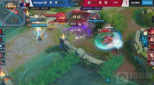 (紧接着第五局,7Kill拿到了花木兰,也是在XQ被破三路的情况下,找到机会,强杀QG的核心位,才能让XQ一口作气的推掉QG水晶,扳回一城)