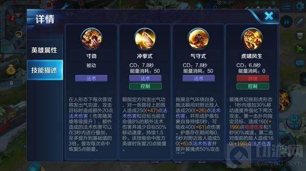 解析:人形态下,向指定方向发出一道气功,对路径上的敌人造成法术伤害及目标当前生命百分比的额外法术伤害,同时会造成短暂的减速。这个技能有着非常高的伤害,目标的生命值越高伤害越高。同时还能够造成减速,由于攻击距离十分可观,所以也是裴擒虎控制留人的有效手段。该技能命中敌方英雄还可以回复一定的能量。