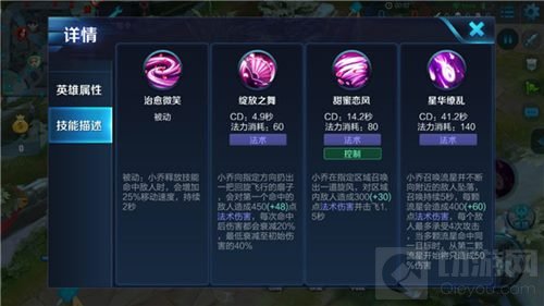 被动技能-治愈微笑:小乔的技能在命中敌方英雄的时候会提高自身的移速,能够提高小乔的机动性,让她在线上能更好的风筝敌方英雄,在团战中也能更好的进行输出。