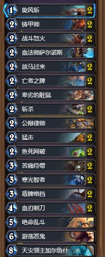这套牌里有大量过牌,所以你为了循环自己的资源来和对面拖疲劳,就必须得把你的“好牌”不断复制。过牌组件有两张战斗怒火,两张猛击,两张苦痛侍僧,两张盾牌格挡,两张爆牌鱼和血法师萨尔诺斯。苦痛的过牌期望是2而战斗怒火是2/3,所以你大概总共可以过15-17张牌。伴随着每个回合的抽牌以及起始手牌,你大约会在第11-12回合进入疲劳。当然情况可能没那么简单因为你可能会卡手。于是你经常发现你会空打很多根本没用的牌。我倾向于尽快把血刃剃刀和游荡恶鬼打掉,并尽可能在8费准时变身DK。