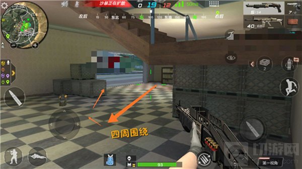 当我们在图中所示的街区外活动时,我们需要依靠两个地方: 一、矮墙; 二、房后。我们可以选择在这两个地方进行蹲点,并且防守一段时间。当敌人朝四面八方走过来时,如果我们的队友引他们过来并且打到他们残血,我们可以快步上前,从矮墙边走过去攻击他们,等到击倒他们之后再回到矮墙继续防守,不然的话待在原地也是一个不错的选择。