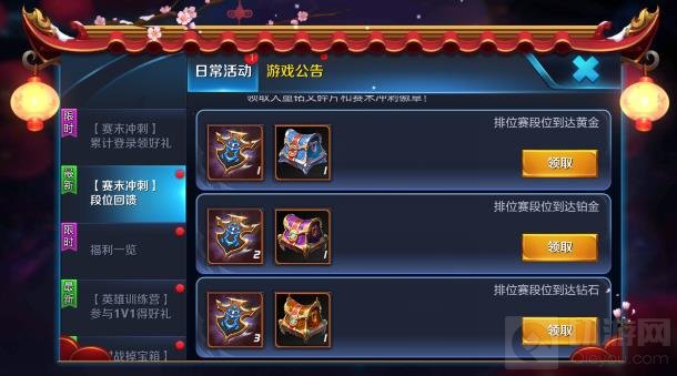 段位达到钻石:赛末冲刺徽章*3+钻石段位铭文碎片礼包*1(打开可得100或120铭文碎片)
