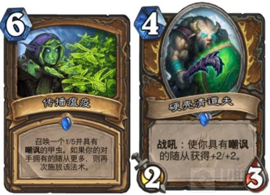 全嘲讽的卡组怎么能少的了他呢?具有嘲讽的随从+2+2,我们就算只BUFF到一个随从,也是2/3的身材+2/2。那么4费出现4费4/5肯定是不算亏的,如果BUFF到两个就赚了,这个不用多说肯定非常赚的特别是配合传播瘟疫。并且不用10费,只要在传播瘟疫的下回合开就OK,下个版本没几个职业能全解传播瘟疫。(选择带一张,如果被橡树的召唤拉出来虽然有点伤但是还能够接受,毕竟BUFF到了就非常赚)