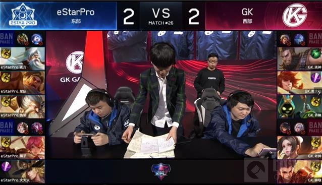 4.6GK对阵eStarPro的生死局,GK处于红色方。GK大胆冒险设下BP圈套,一阶段没有选择与eStarPro一样的常规BAN人,而是将对手手感大热的张飞+诸葛亮送上BAN位。此时先手选人的eStarPro陷入困境,当时最优选的三个英雄姜子牙、裴擒虎和程咬金都在外面。这里如果选择程咬金或者裴擒虎其中任何一个,送给对手姜子牙加另外一个,结果都不堪设想。考虑良久后eStarPro还是无奈拿到姜子牙,GK顺势敲下裴擒虎+程咬金的版本一二哥组合,后续补出太乙真人补强前期,同时用金钱BUFF对抗对手的经验BUFF。二阶段BP中,eStarPro蓝色方优先敲定阵容,GK最后一选带来致命counter哪吒,本身马可波罗对哪吒就很没办法,中单姜子牙更是哪吒的囊中之物,同时哪吒前期的dot伤害比较理想,有益于整个阵容的前期过度,这里最后哪吒的选择也直接为本场的实战发挥奠定了良好的基础。这里GK先设一计再接一伏,可谓算无遗策环环相扣。