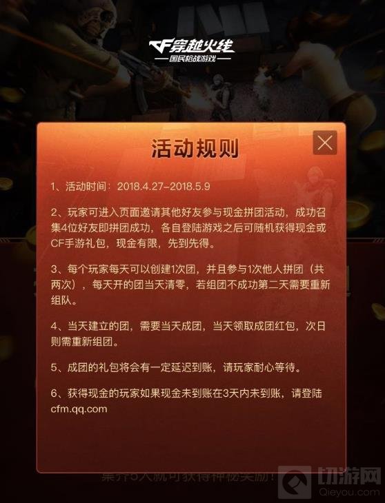 CF手游红包活动每位玩家每天可分享一次活动,并参与一次好友的活动分享,即每天可领取两次红包奖励。需要注意的是,玩家当天建立的拼团,需要在当天完成拼团并领取红包,次日则需要重新组团。