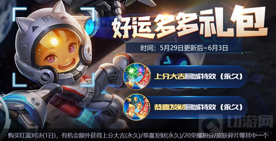 欢庆六一,回城特效礼包限时上架。购买红蓝对决(1日),可额外获得上分大吉(永久)/恭喜发财(永久)/荣耀积分*20/皮肤碎片*2/新品英雄抽奖券*1/新品皮肤抽奖券*1/亲密玫瑰*1/钻石*20其中之一。