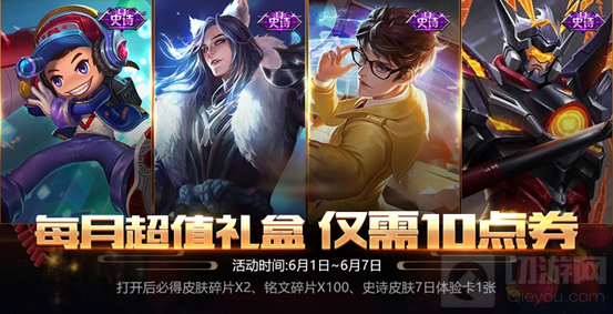 每月超值礼盒限时来袭,惊喜福利仅需10点券。打开后必得皮肤碎片*2、铭文碎片*100以及史诗皮肤7日体验卡1张:鲁班七号-电玩小子、李白-千年之狐、诸葛亮-黄金分割率、吕布-末日机甲其中之一。