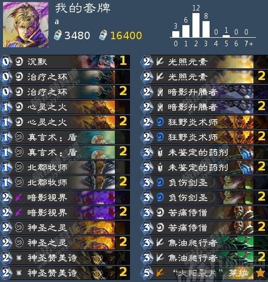 心火牧的斩杀和OTK套路不同,靠的也是随从,而超级大哥最怕的就是嘲讽,几十点攻击力撞对手的墙总感觉蠢蠢的,为了避免心火一套的时候尽量不被对手的墙卡住,沉默是必须的,并且因为是0费,不会影响我们的计划和斩杀节奏,另外一方面也是为了控场,有时候对手会出一些强力的生物,或者buff,给我们很大压力,这种情况就非常需要一个沉默救场,相比中立卡沉默,牧师这张0费更优秀,还能配合莱拉刷牌。
