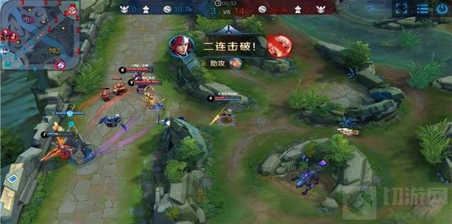 2.在拿到红BUFF到达二级后,如果敌方上单压线过深,韩信可迅速支援配合队友进行击杀。Gank的原则为帮优不帮劣,即帮助优势路队友进一步扩大优势,滚起雪球。在gank时二技能起手突进,靠近对手后使用一技能击飞对手,待敌人交出位移技能逃跑后再使用第二段一技能追击;在gank有控制技能的英雄(比如妲己)时,二技能进场后一技能击飞对手,并衔接大招打出连续击飞,击杀对手。