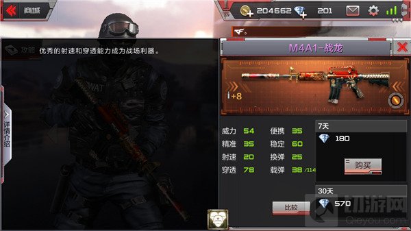 第二个登场的是M4A1战龙,这把枪在各项指标上都算的上是紫色级别的M4A1中的最优,尤其是在穿透性和便携性方面,战龙的表现十分突出,我们都知道M4A1的穿透性能十分优异,战龙在基础版本上做了进一步加强,可以说是将穿透性发挥到了极致,当我们遇到一些木制掩体或者一些木门等障碍的时候,如果后面有敌人,我们完全可以大胆的开枪,是能对后面的敌人造成一定伤害的。此外,在图我们可以看到,这把武器的消音器还是比较长的,这也让他拥有了更高的子弹初速度,这也是他威力大和穿透力强的关键所在。但这把武器的价格相对更高,获得难度更大。