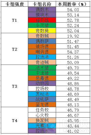 1、胜率表格同样表现出各职业平衡的状态。多数竞技级卡组的胜率都没有太大差别,唯一的例外是术士,这个职业似乎全方位再次超越其他卡组。