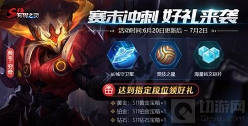 6月20日-7月2日,玩家达到黄金、铂金、钻石段位可以从活动页面分别领取黄金宝箱、铂金宝箱、钻石宝箱,打开宝箱后,玩家不仅可以获得不同数量的竞技之星、铭文碎片,还有机会额外获得不同期限的长城守卫军回城特效体验卡。