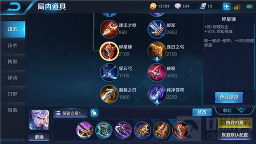 狩猎宽刃升级后的巡守利斧进一步提高铠对野怪造成的伤害,获得的寒冰惩击还能帮助铠留人,提高Gank成功率。暗影战斧是战士最实用的装备之一,物理攻击、物理穿透、冷却缩减等属性的加成让铠的杀伤力更足,被动还有机会减速敌军。宗师之力和无尽战刃可以大幅提高铠的暴击率和物理攻击,并额外提高暴击伤害,是铠强杀对方C位的核心两件套,且铠通常都是二技能进场,刚好可以触发宗师之力的被动,提高不少伤害。碎星锤具有较高的百分比物理穿透和物理攻击加成,让铠在面对敌方坦克时依旧能打出超高的伤害。