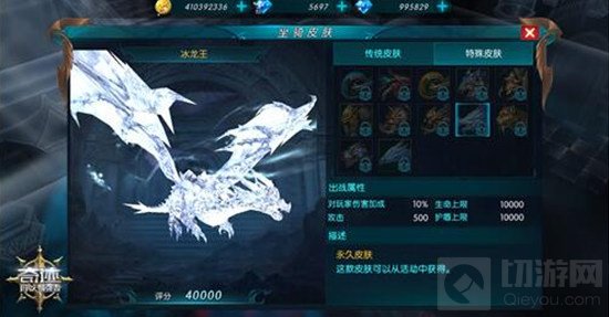 坎特鲁暴龙是霸王龙的化身,冰龙王则有着《权利的游戏》中巨龙般的气势。冰龙王这种站在食物链顶端的生物,对于处于弱势的人类而言,有机会驾驭翱翔那绝对是想也不敢想的梦。此次版本更新后出现的冰龙王皮肤与经典魔王黄金火龙王同属一脉,也是龙之乡的霸主。冰龙王出战属性不俗,对玩家伤害加成提升10%,生命上限提升10000,攻击提升500,护盾上限提升10000。冰龙王坐骑皮肤是目前版本中,生命上限和护盾上线提升最显著的皮肤。这样的护主神器,还是永久性皮肤,这样的绝世坐骑皮肤,拼尽全力也要收入囊中。
