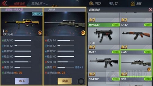 如图,巴雷特-齐天大圣和AWM相比,前者在威力、穿透和载弹数上领先,但便携数值弱于后者。即:后者手持移速更快,但威力没有前者高,需命中对手胸部或以上位置方可将之淘汰。