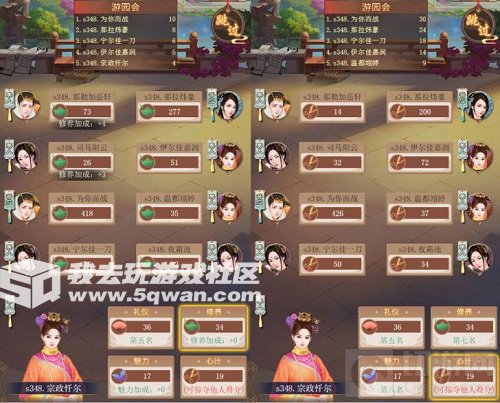 游戏中,游园会一天会举办五次,每次的地点和时间都不同。玩家可以在每次游园会举办之前派出自己的妃子去参加游园会。参加游园会的妃子至少要有美人的称号,妃子的称号越高级,在游园会的斗技中就越有优势。