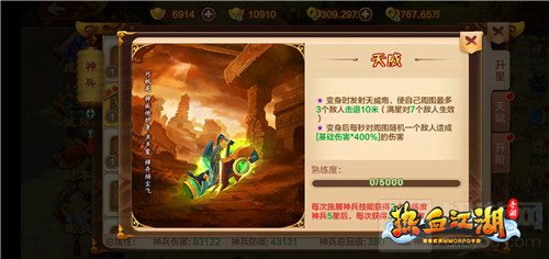 神武天威炮“震腾、贯骨、弹舞、清海、狂炮”五大天赋分别提升神兵伤害、气功伤害、攻击、内力、造成伤害,全面提升玩家战斗力。控制性高伤神兵,这把攻城利器果然实至名归。总之,此神兵攻击力、控制效果双双惊人,打架PK绝对是一把利器,在“神兵乱战”和“城战”玩法也都会大放异彩。