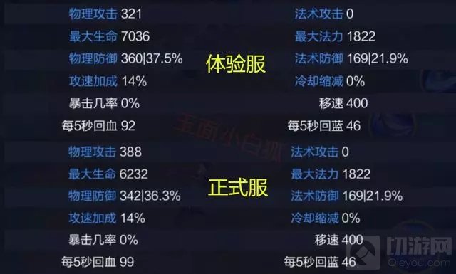 1级兰陵王的属性对比如下:体验服削弱了初始攻击、初始血量、初始护甲。