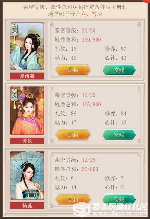 册封妃子能够增加君主的四维属性,进而增强国力,同时还可以提高被册封后妃子所生皇子的资质。册封之后,妃子将会更换封号。游戏中,妃子封号共有八种,这些封号等级由低到高分别是美人、答应、常在、贵人、嫔、妃、贵妃、皇贵妃和皇后。妃子的封号越高级,国力提升的幅度就越大,所生皇子的资质也会更高。
