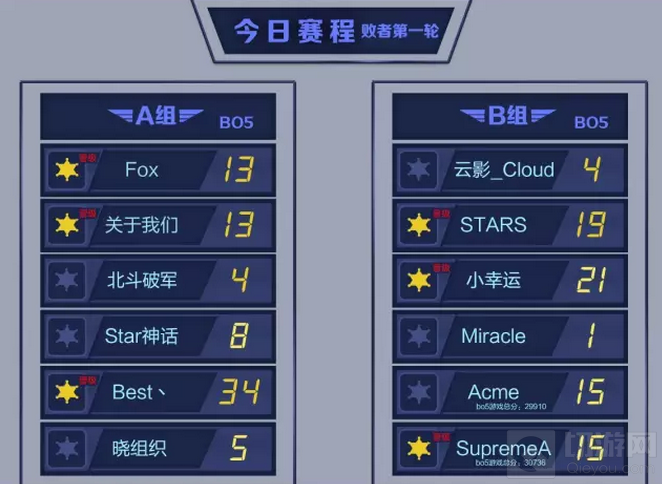 注意:此处SupremeA队与Acome队积分同为15,但SupremeA队伍本次比赛游戏总分为30736,高于Acome队伍本次比赛游戏总分29910,SupremeA队伍成功晋级!