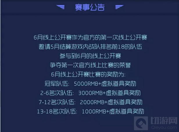 本次公开赛参赛队伍由5月战队排行榜前18名战队构成,本次赛事为期一个月,每月前四周周六为比赛日,本次赛事为参赛战队准备了丰富的虚拟道具和现金奖励。