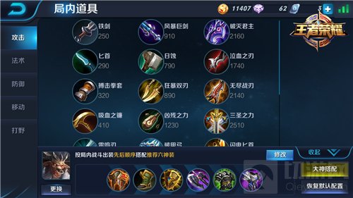 六神装:红莲斗篷,影忍之足,军团荣耀,暗影战斧,振兴之铠,霸者重装