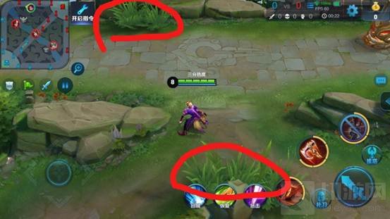 二塔之间红圈标记的这两个草丛可以用来蹲回家补状态或者死亡后回线上的人,但是注意卡视野进草丛,地方没兵线时上方草丛最佳;有兵线时蹲在下方红圈草丛,如果敌人走位靠上则不会看到视野。这种游走方法很容易连续帮助上路建立优势,打崩敌方的发育节奏。