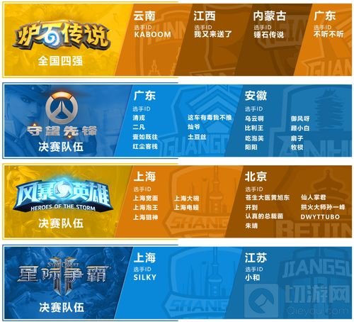 由网易暴雪举办的第四届精英实力赛将于12月31日15:00于上海互联宝地(D1-104/D1-105)正式开战,与以往精英实力赛不同的是,本届精英实力赛全面升级,四大暴雪热门游戏齐聚一堂,十支代表各自省份从民间脱颖而出的队伍将展开最精彩的对决,分别向《炉石传说》、《守望先锋》、《风暴英雄》、《星际争霸II》四个项目的冠军发起冲击!目前,赛事专题页面已经上线,你可以通过专题页面查看更多赛事信息及观看精彩比赛直播。