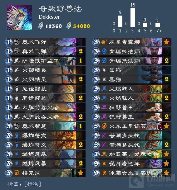 这是Dekkster在五级使用的一套奇数快攻野兽法。由于奇数法需要放弃变羊和暴风雪,它往快攻方面发展似乎更加合理一些。这套牌令人耳目一新的地方就在于它携带了狂野兽王和苦潮多头蛇的配合。狂野兽王本身是334身材十分扎实,而其buff野兽的能力也使得这套牌带上了穆克拉。这套牌一费能出的随从有六张,两费点2能解决掉其他快攻的很多生物如烈焰小鬼,圣光护卫者,三费开始逐渐变得有威胁,而五费的苦潮多头蛇已经很难有人能解掉了。有时候为了给对手压力,可以对手空场时使用燃烬风暴让对手陷入解场还是回血的两难境界。这套牌节奏很顺畅,基本7费能准时拍出龙鹰之神,c罗射门斩杀。它构筑新颖,希望狂野兽王能有很好的发挥。