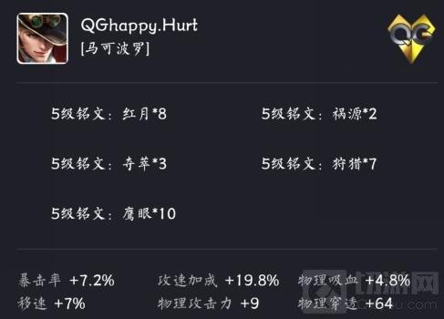 刺痛选择了八个红月、两个祸源、三个夺萃、七个狩猎、十个鹰眼。众所周知,对马可波罗而言最重要的属性是攻速,攻速的提升能增加一技能和大招的子弹数,也能更快的打出被动真实伤害。其次,由于马可波罗是一个攻速流射手,有更多的机会去触发暴击,所以需要一定的暴击几率来增加前期爆发,而且马可波罗的真实伤害也是可以暴击的,所以拥有暴击的马可波罗后期对坦克也是致命的!最后,三个夺萃是野区续航能力的保证,没有一点吸血铭文的马可在刷完整个野区后是很伤的,小伙伴们一定不要忽略。