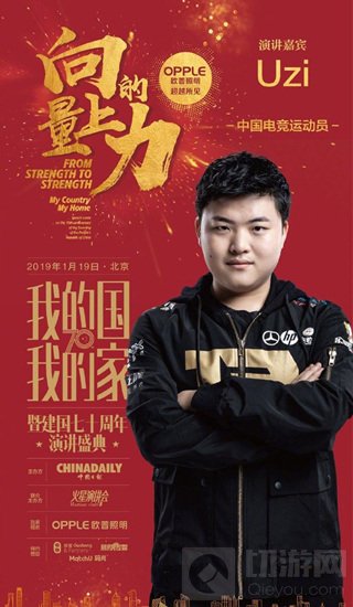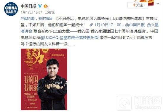 “不只是玩,电竞也可为国争光!Uzi喊你来听课啦!与其仰望,不如并肩,他们和祖国一起成长!1月19日17:00,中国日报、火星演讲会联合举办“向上的力量——我的国·我的家暨建国七十周年演讲盛典”。中国电竞运动员Uzi、皇族电子竞技俱乐部邀你一起倒计时7天!他很厉害吗?懂行的网友来科普一波……”
