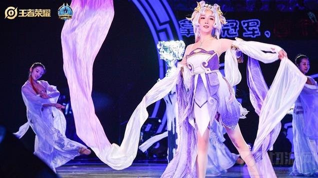 随着比赛时间的临近,王者荣耀的新英雄嫦娥衣带翩跹地出现在了冬冠杯决赛舞台,成熟的AR技术带来了一场真正的仙女下凡,随着嫦娥仙子的落地,演员陈小纭化身真人嫦娥,与众伴舞演员一同献上了一场出尘脱俗的演出,首届冬冠杯的冠军奖杯——冰凤凰杯也随之出现在现场舞台。