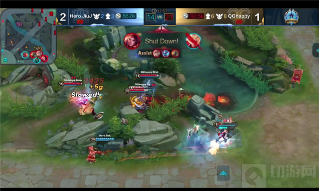 我们可以看到,QGhappy在7分钟左右,四人抱团率先进攻Hero久竞孙策所在的边路,抓死孙策,限制其的发育,打开第一个突破口。这样的对局方略,在平时排位中处于劣势的时候,绝对是用来打破僵局的绝佳办法。而后当打开第一个突破口后,QGhappy并未放缓脚步,而是继续开始了反攻战,配合队友边路转野区,开始进攻Hero久竞的野区资源,让己方得到了更好的发育。而对于Hero久竞边路的针对QGhappy也从未落下,在抢夺下野区资源之后,QGhappy则将目光转到了Hero久竞的上路,配合队友继续拆塔。外塔被破的Hero久竞陷入被动,而此时QGhappy的公孙离已然发育完成,开始了Carry!
