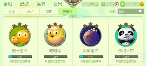 选择关键词皮肤一栏,可以立刻查看到关键词的收集进度,这些皮肤首先要通过开启宝箱的方式将它打开,之后再在每一次的升级中慢慢累积进度,最快的方法就是充值啦,不过多多打比赛,开启的进度会增快很多的哦。