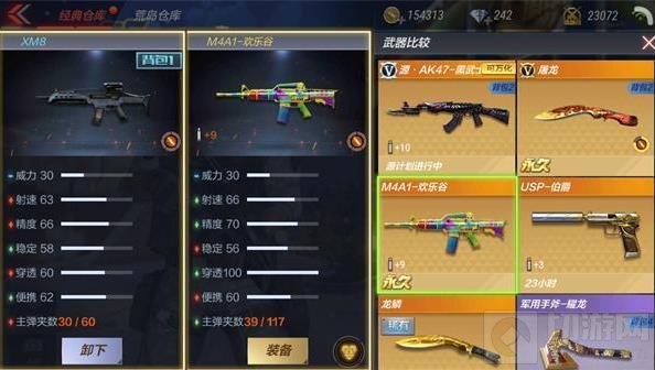 如图,XM8和橙色品质的M4A1-欢乐谷相比,前者稳定和便携数据强于后者,其他除威力一致外尽皆弱于后者,即:两者不具备可比性,无论是正面作战还是穿透输出。