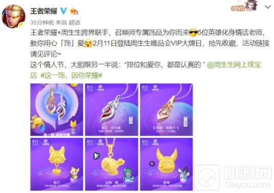 王者荣耀官方微博今天宣布:《王者荣耀》将与周生生珠宝进行跨界合作,推出5款召唤师专属饰品,想要了解的召唤师就一起来了解一下。
