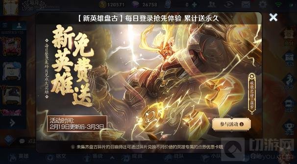 2月19日更新后起累计登录游戏收集盘古碎片,集齐盘古碎片*20可兑换永久英雄-盘古,每天还可领取盘古英雄体验卡抢先体验全新英雄!