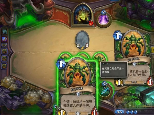 这样,很快你的手上就会有很多高质量的野兽了,如果前几张野兽太差也可以考虑直接重来。中期控住节奏后尽量多铺场织网蛛,洛欧塞布有两张剧毒之种,不要把很难得抽上来的“大禽兽”白白送掉了。