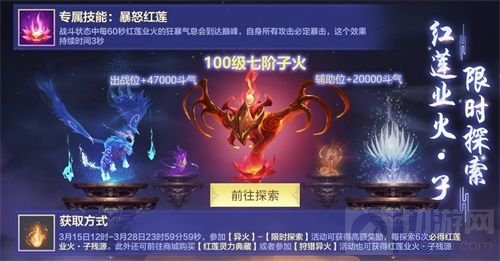 在这片茫茫天地间,存在着一些天地异火,或许是天降陨石中心所携带的那簇火苗,也或许是火山深处,被锻烧了千百年的的熔岩地火。在2019年3月15日— 3月28日,斗者可通过【异火】界面,参与【限时探索】,在活动期间内,通过限时探索活动获得红莲业火·子的概率大幅提升。