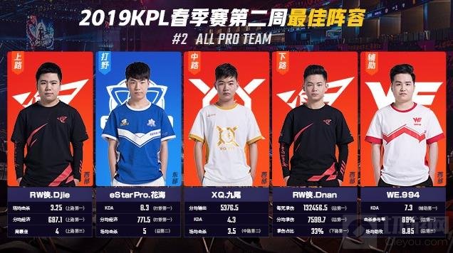 RW侠.Djie(渡劫)蝉联最佳上路;其队友Dnan(渡难)与之一同上榜。XQ中路选手九尾使用不知火舞“逆风翻盘”让“法刺”热潮再次重回KPL赛场;WE辅助994,开团时机准确;eStarPro新秀花海野区制霸力十足。