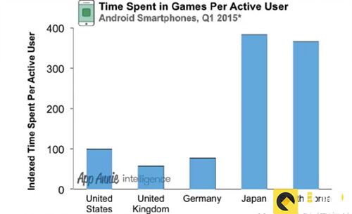 “平均来看,日本安卓智能手机用户每月打开游戏的次数约为美国用户的3倍,为英国用户的7.5倍。”报告写道。“东西方移动应用差异巨大。2015年第一季度,在日本和韩国,游戏是安卓智能手机用户投入时间第二高的移动应用类型,仅次于通讯类应用。”